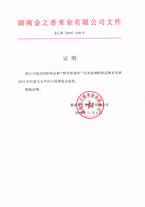 國家金獎品種野香優(yōu)莉絲走出國門,走向世界,代表湖南南洲蝦稻品牌米榮獲2019年巴拿馬太平洋萬國博覽會金獎!